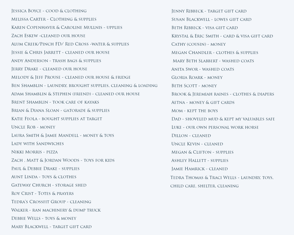 It is said that God will give us no more than we can handle. I’m not sure who came up with this mindset, but I couldn’t disagree more with whoever said it. June 23, 2016 was far more than I was able to handle. More than most of us could. I simply turned to Him and asked that He handle it for us and show us the way, and that’s exactly what He did. It was a Isaiah 41:10 playing out in real life. It was us literally praising Him through the storm knowing He is Who got us through those hard moments. He used so many people for His work during those weeks. I kept a list of every person who showed up to help, reached out to check on us, sent money and supplies, fed us, or simply just showed up with hugs and prayers. Every single part of that helped us to recover and move forward. God sent each one of you all to us and for that, I am forever grateful.